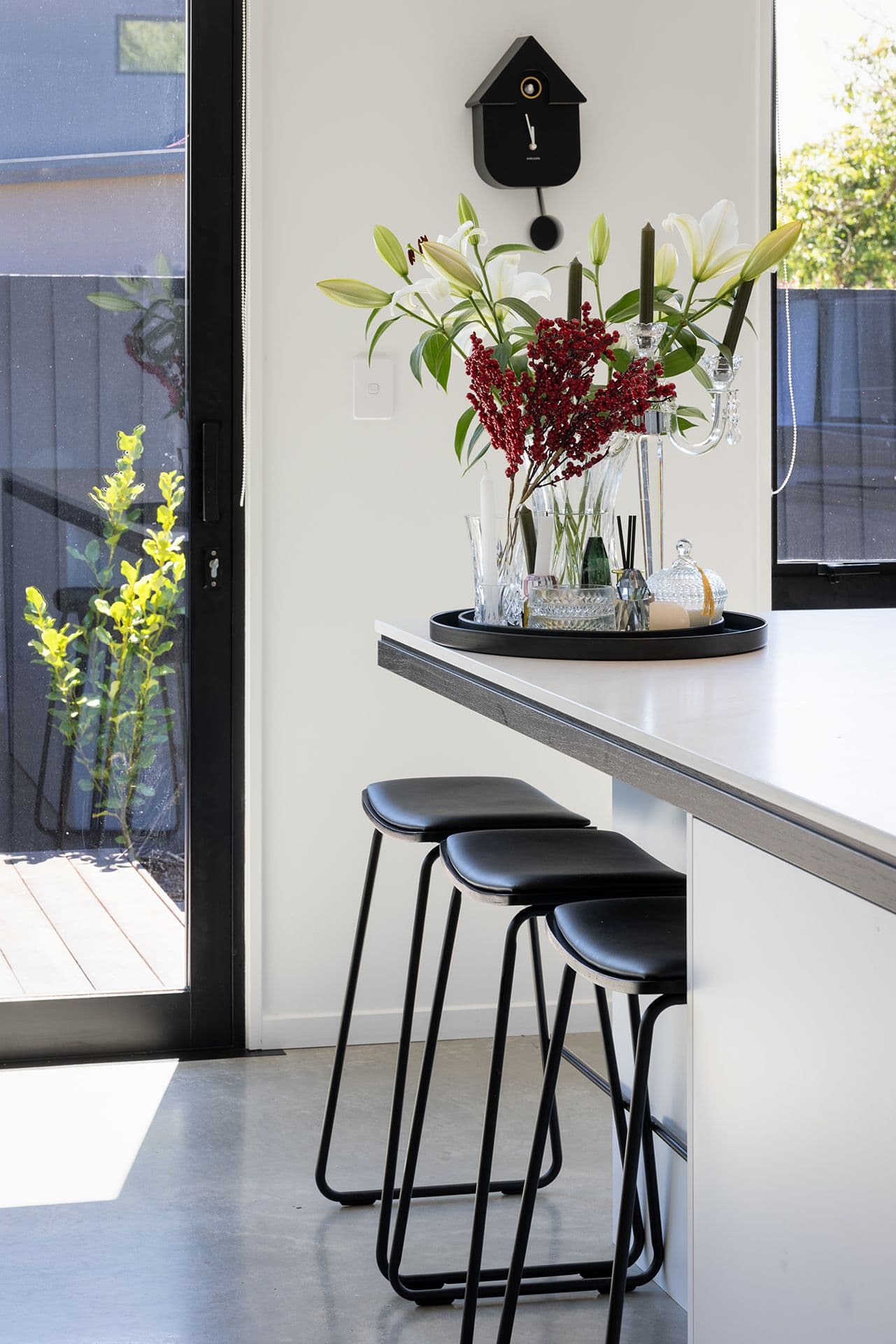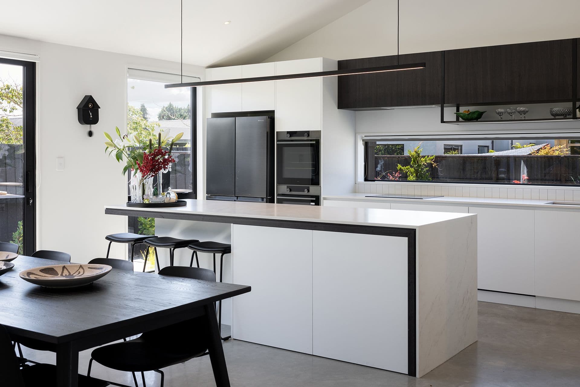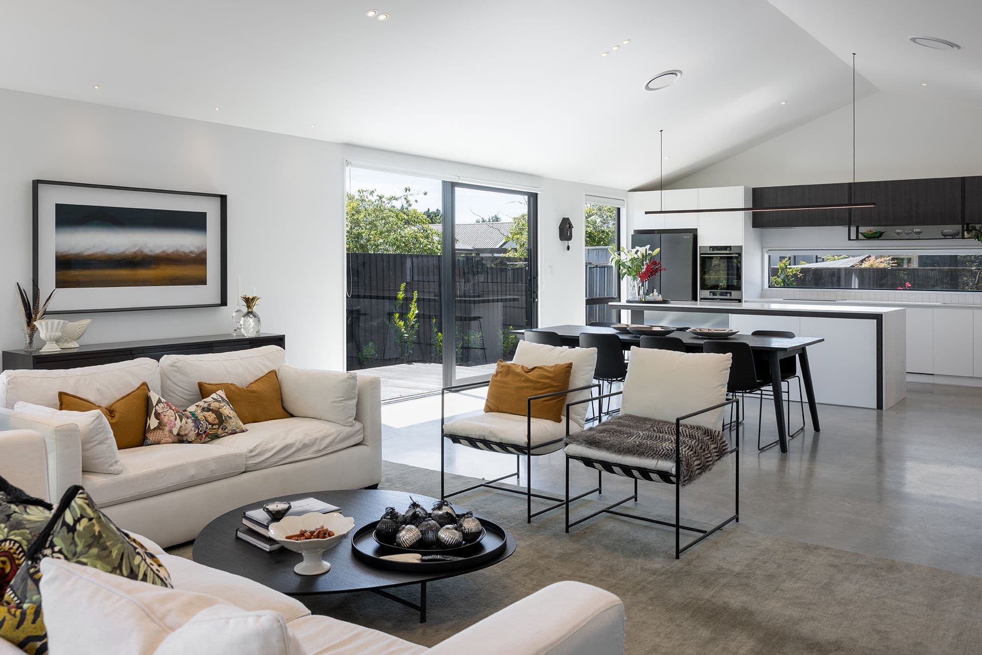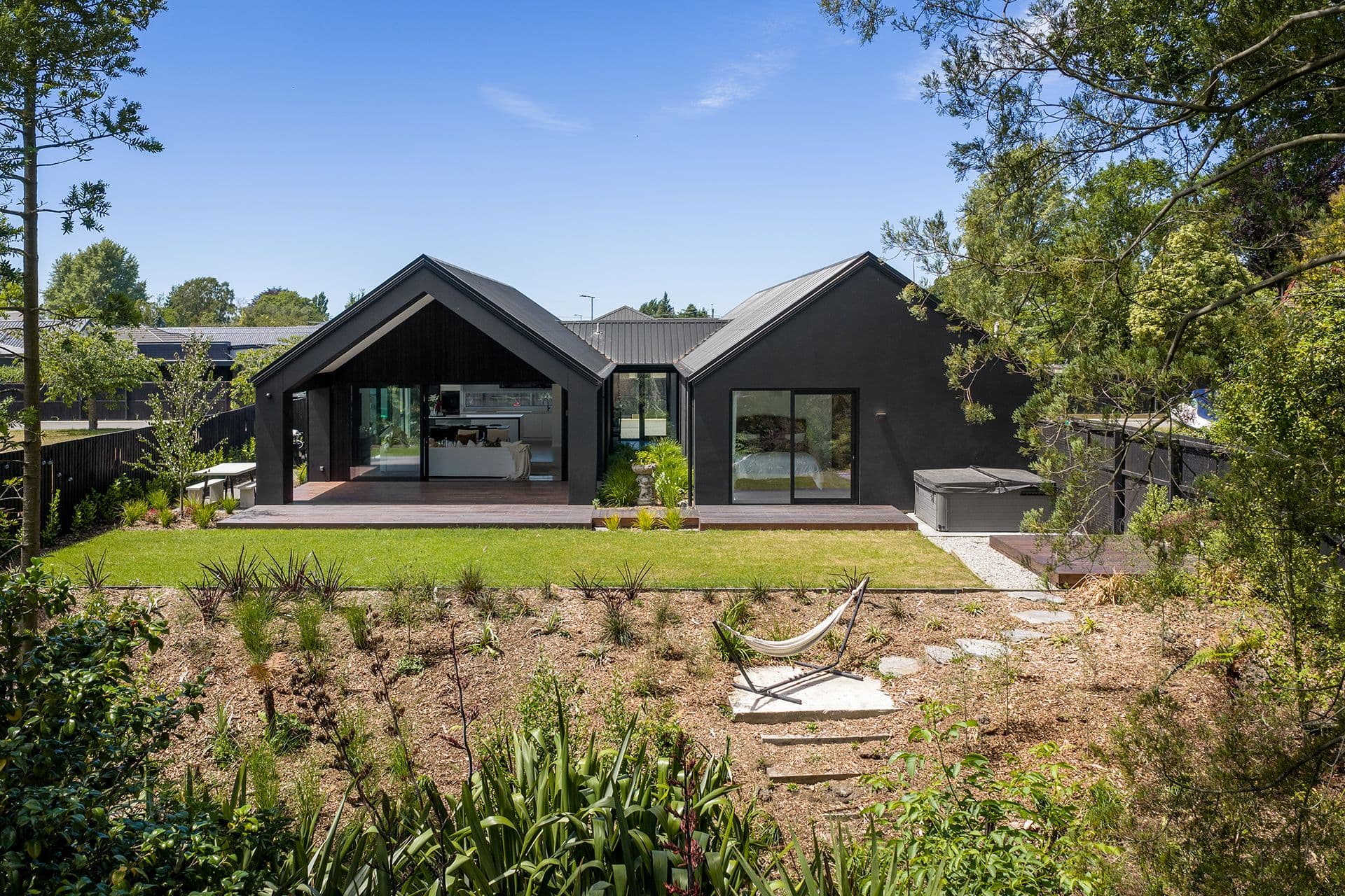 Striking and contemporary, this architecturally designed home pairs bold black cladding with light-filled interiors and seamless indoor-outdoor flow. Twin gables frame open-plan living, extending to a covered kwila deck and landscaped garden. A sleek monochrome kitchen, polished concrete floors, and refined finishes create a sophisticated yet welcoming retreat.