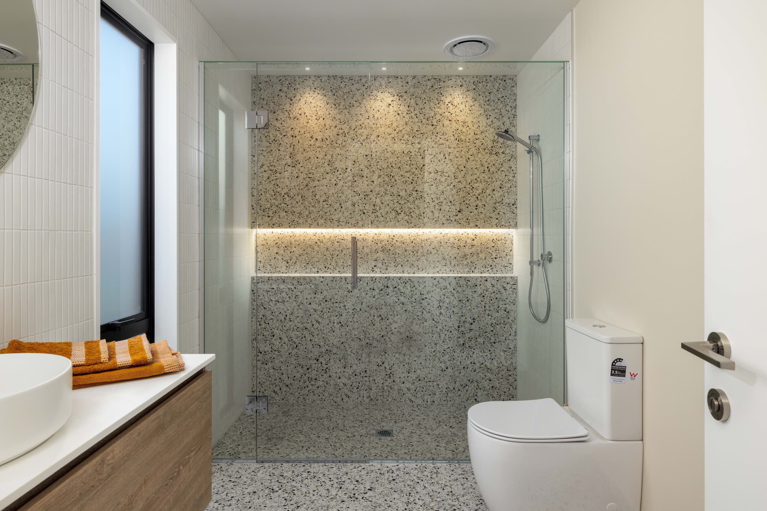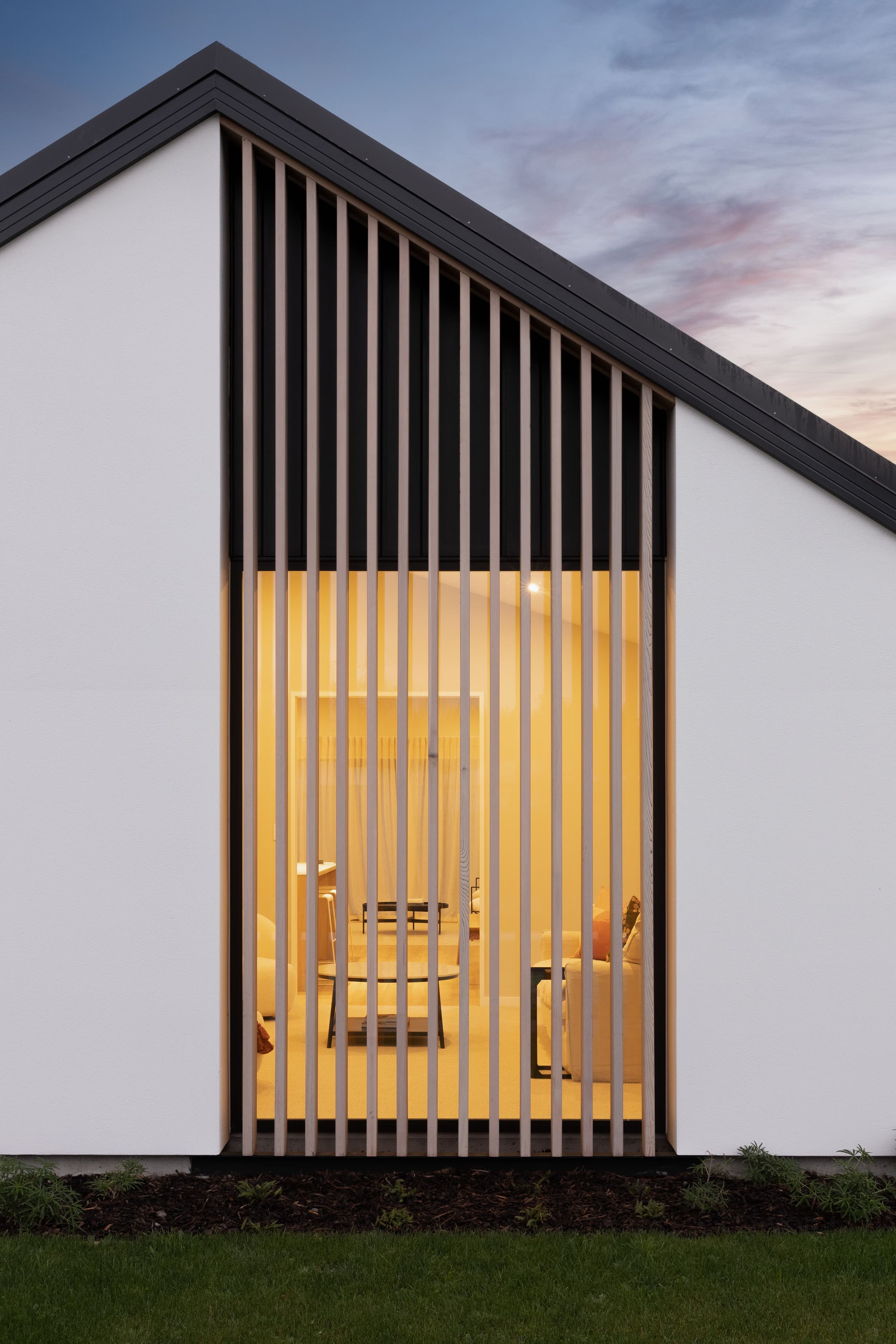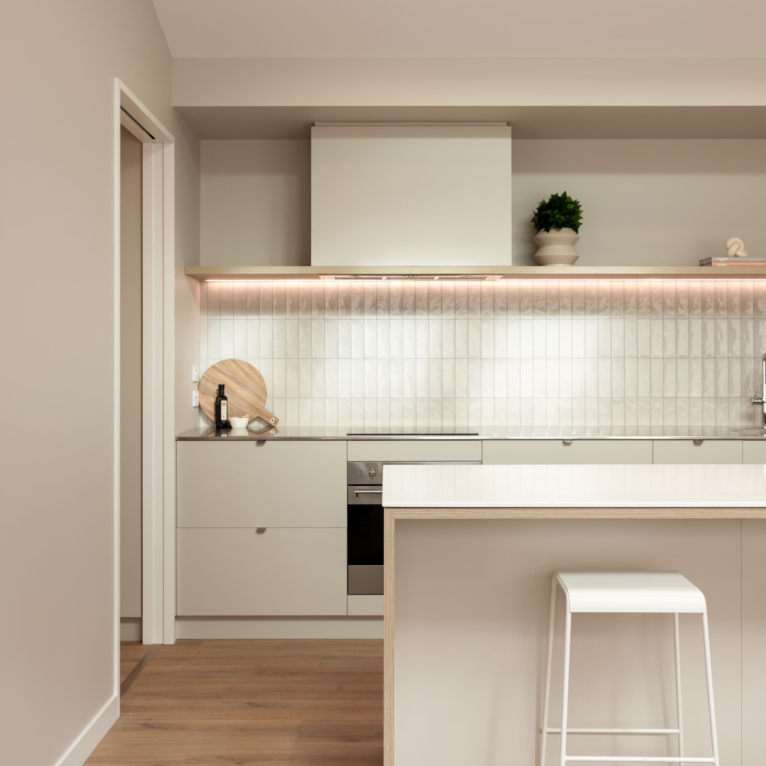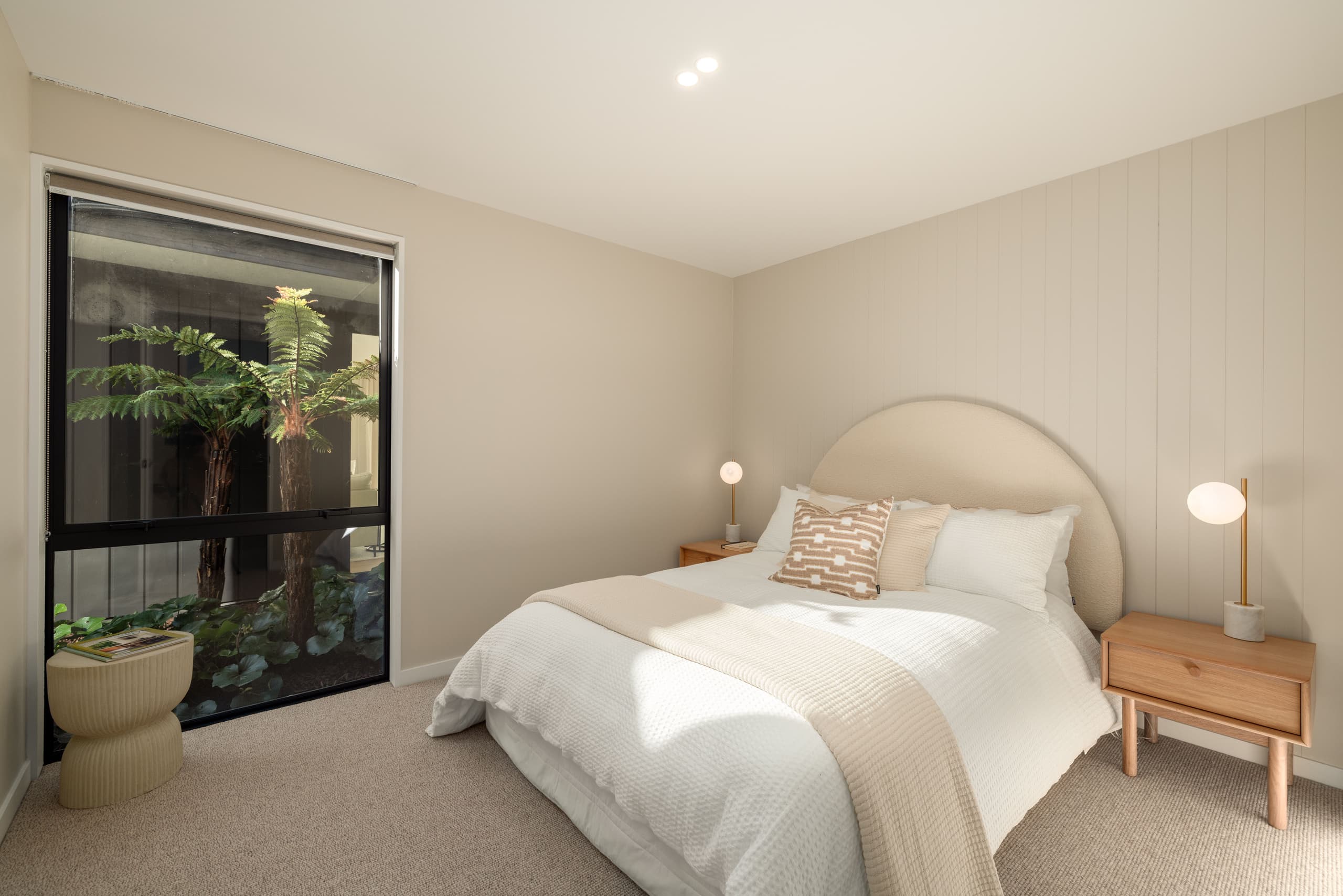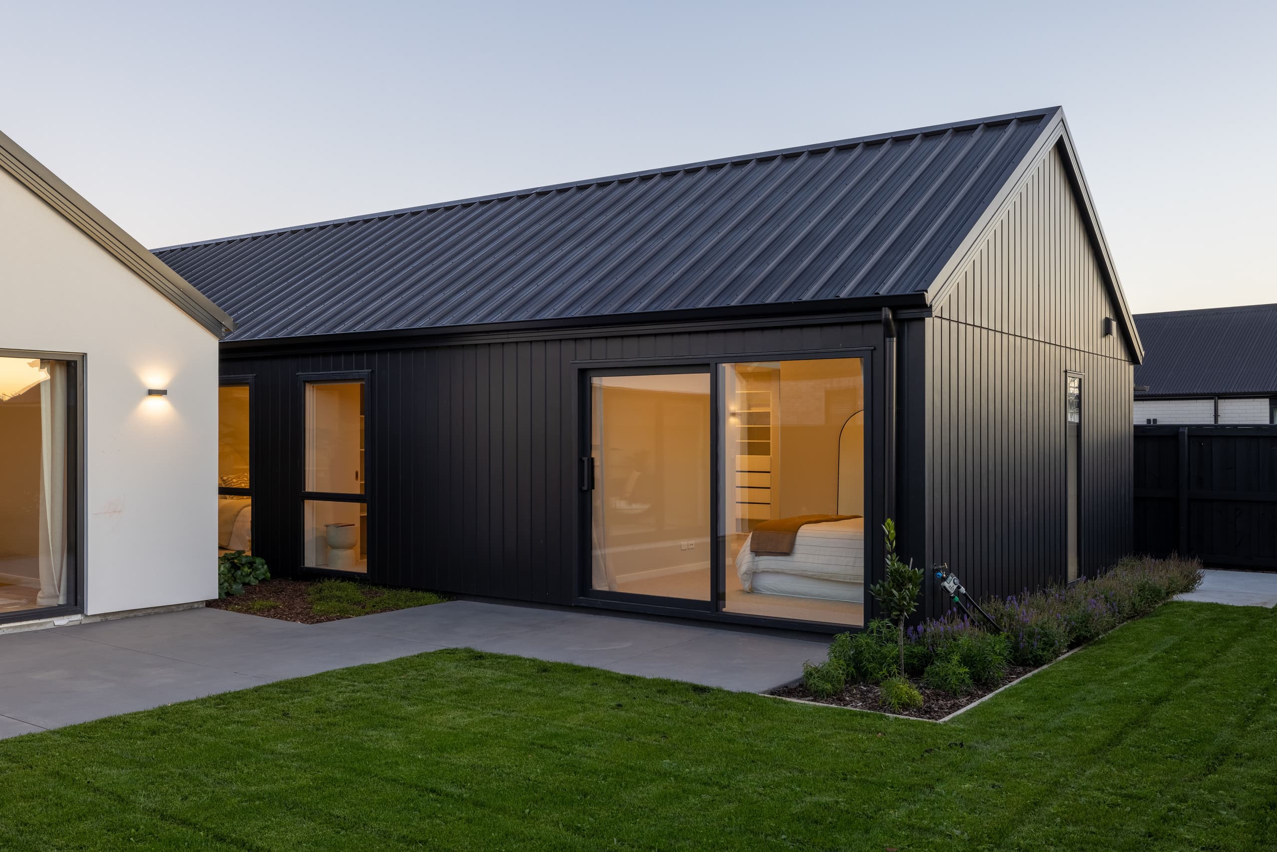 Designed with the flexibility demanded by modern family living, the Oakbridge is a 220m² pavilion home that captures all-day sun and creates shelter with multiple courtyards. A contemporary façade pairs cedar slats with flush Oblique cladding and an integrated garage door. Step through a look-through feature entry into a spacious foyer, where a picture window frames a native fern garden. Open-plan living and dining soar under pitched ceilings, with an impressive Velux skylight feature flooding the interior with light. The gourmet kitchen and butler’s pantry glow with strip lighting and stainless-steel benchtops, finished with wool carpet and laminate flooring throughout.