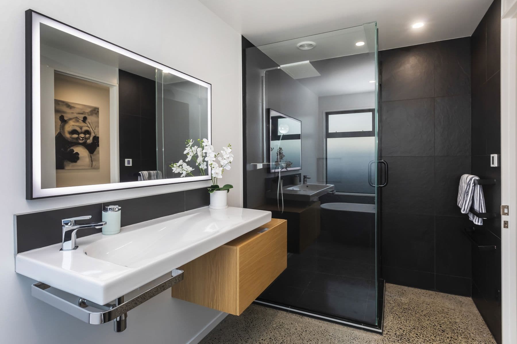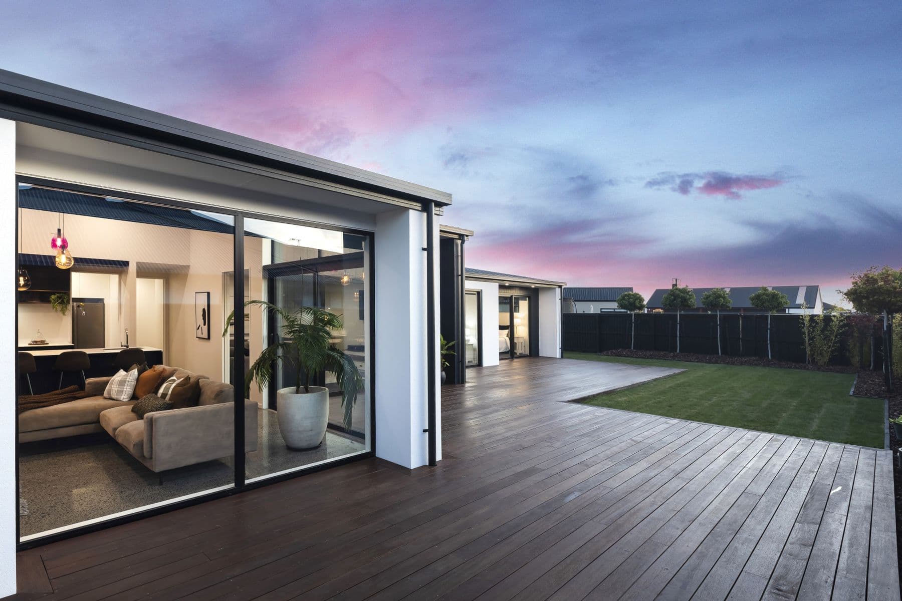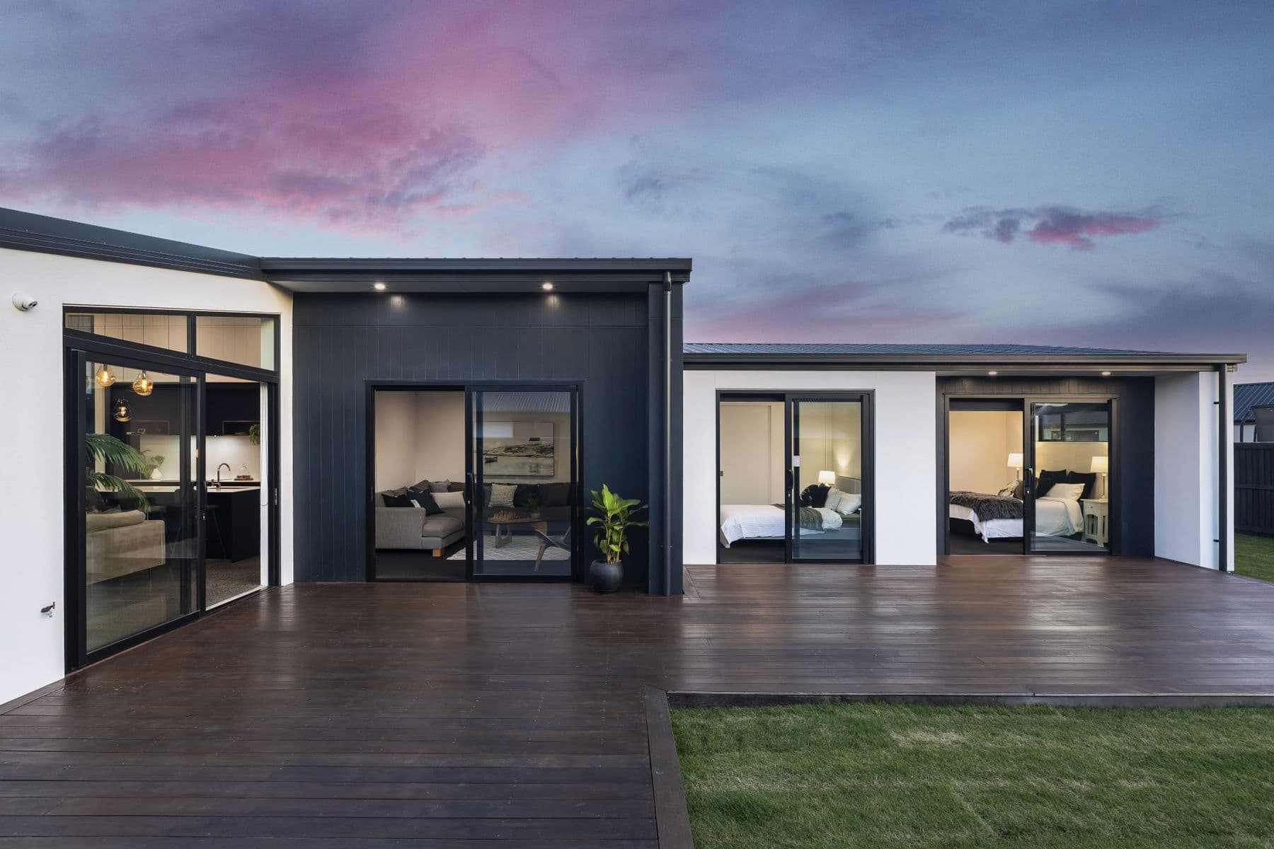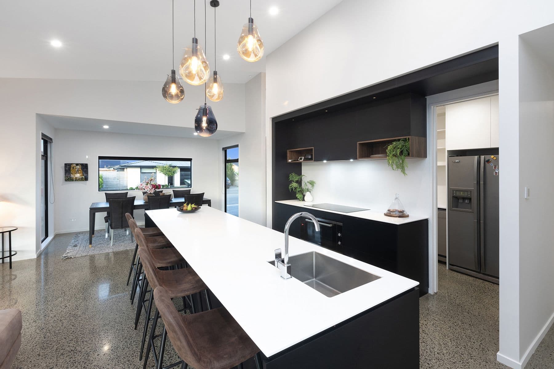 This design and build features a kitchen with high-spec built-in appliances, a walk-in scullery, an exquisite stone benchtop, and ample surplus storage. A raking ceiling of 4.5m provides an excellent sense of space and ensures the main hub is continuously filled with natural light. The gas fireplace in the open-plan living space sets an intimate tone, balancing the polished concrete flooring flowing through to the rest of the home. The generous family bathroom with a freestanding bathtub and separate walk-in rainfall shower the family well, complemented by a separate toilet. Three double bedrooms are thoughtfully enhanced with full-size double wardrobes in each. The hall leads to a luxurious master suite, with a walk-in wardrobe, a separate ensuite, and access out to the private rear section.