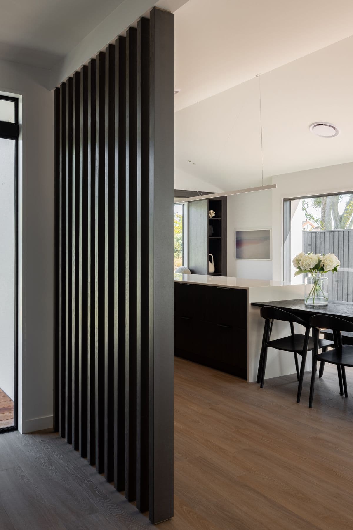 A striking stone schist wall welcomes you into an expansive living space seamlessly blending indoor and outdoor living. The kitchen features a trendsetting bi-fold pantry, while the master bedroom boasts compact elegance with a scissor truss ceiling and luxurious ensuite. With premium materials and sophisticated design, this home epitomizes Central Otago living, showcasing Benchmark's craftsmanship in Wānaka and Queenstown.